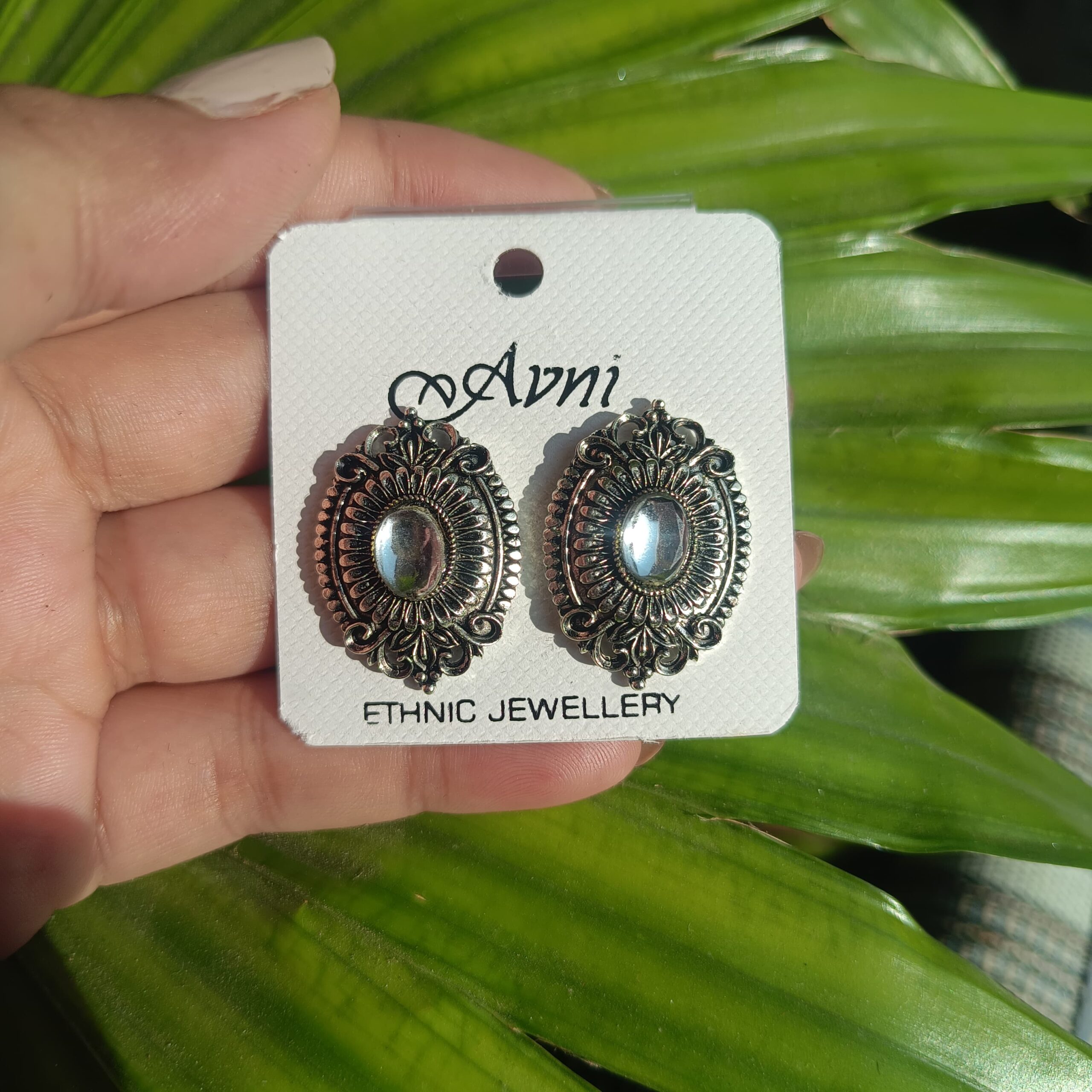 Bring a vintage charm to your look with our Antique Oval Oxidised Studs. The elegant ethnic patterns and metallic shine make these earrings a versatile match for kurtis, sarees and Indo-western outfits — stylish yet budget-friendly!