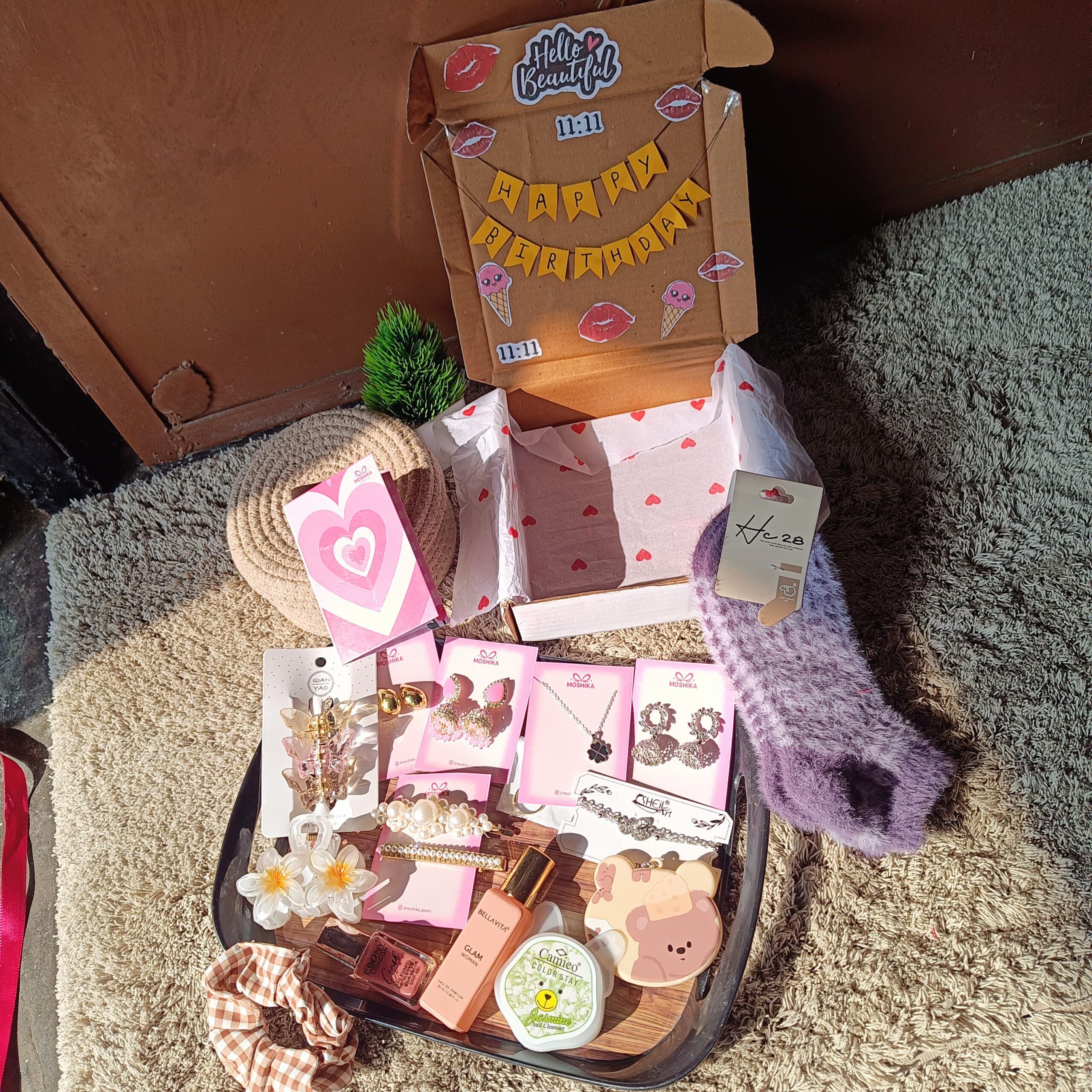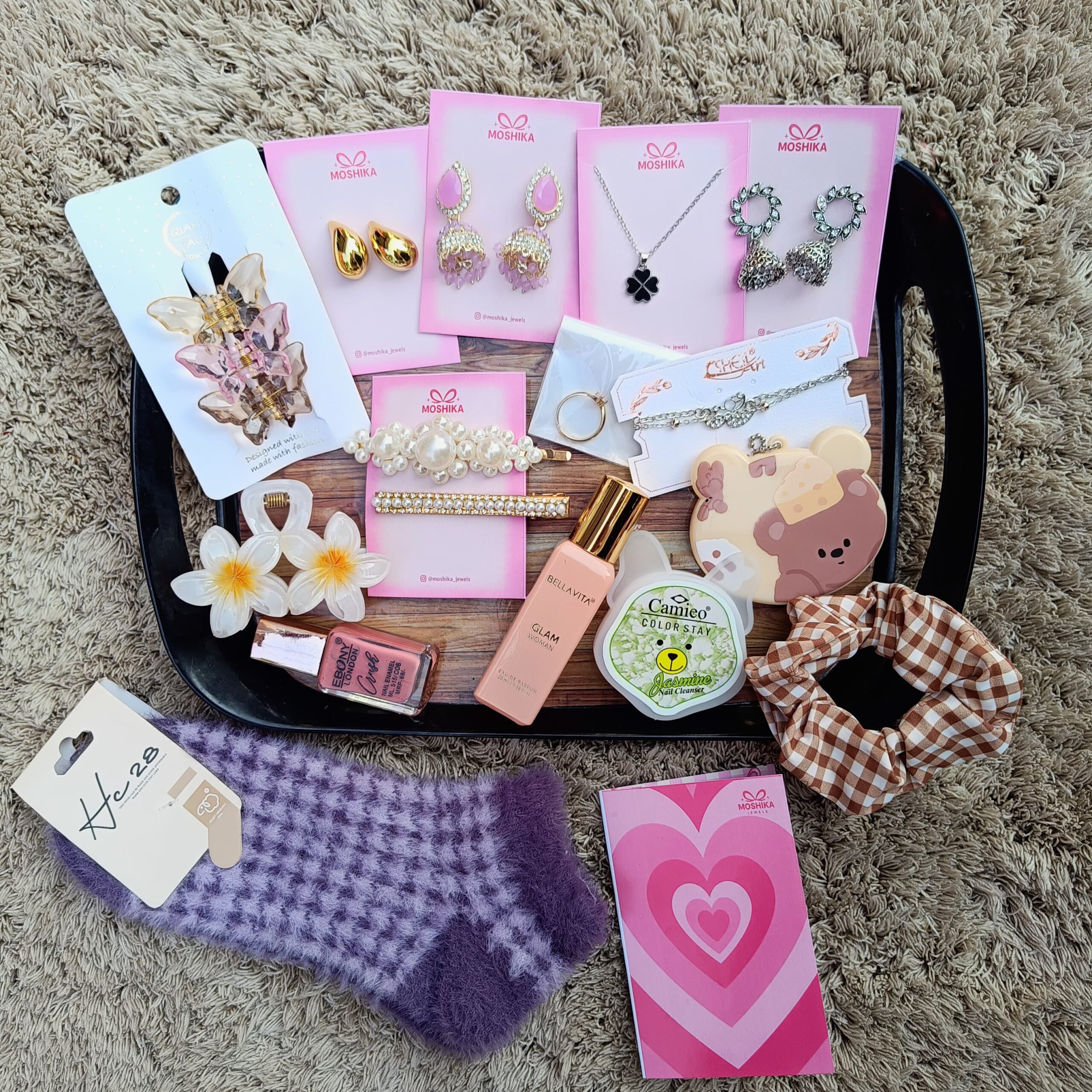 Beautifully arranged in a stylish gift tray, this hamper is perfect for birthdays, festive gifting, or pampering a loved one. The combination of fashion accessories, self-care items, and fragrance makes it a thoughtful gift for any occasion.