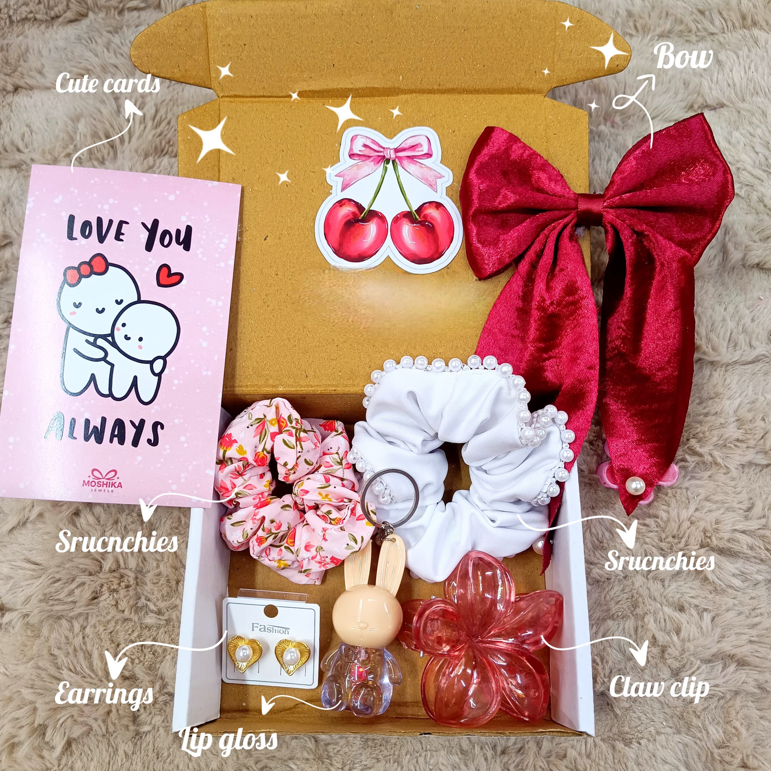 The Cute Surprise Box is a charming bundle of everyday favourites. It includes two soft scrunchies, stylish earrings, a glossy lip gloss, a cute claw clip, and an elegant bow. Finished with adorable cards, this box is perfect for spreading smiles in the simplest way.