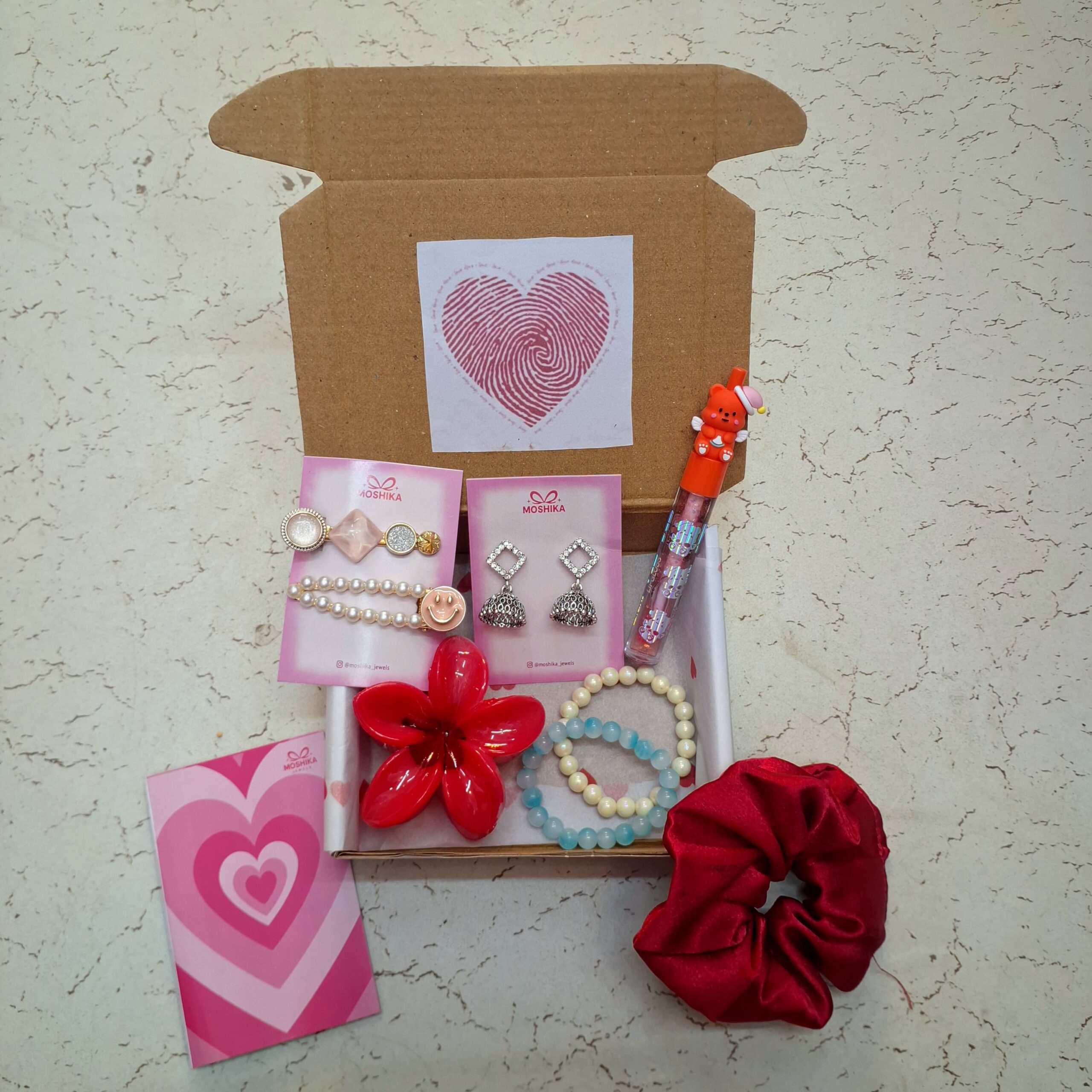 The Elegant Charm Mini Hamper is designed to bring effortless beauty and sophistication to your everyday look. This compact yet classy set features elegant jhumke, trendy accessories, and a touch of gloss for a radiant finish. Perfect for birthdays, small gifts, or self-care treats, this hamper adds just the right amount of sparkle and charm to any occasion.