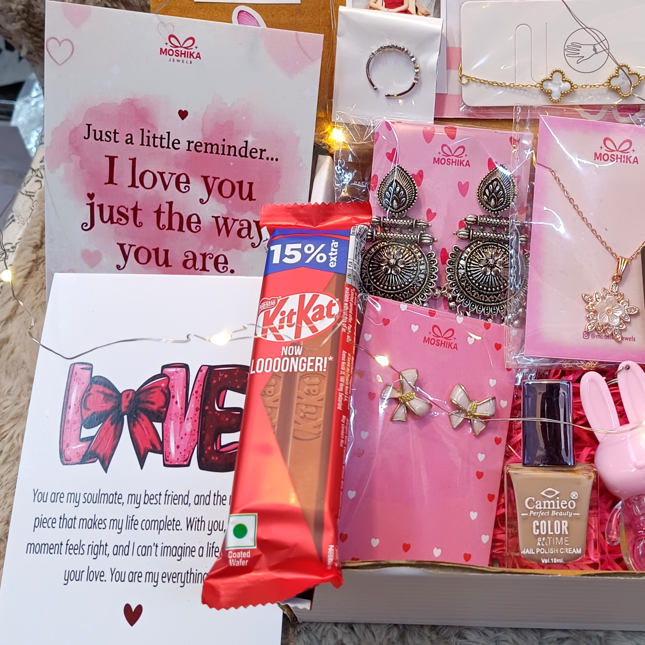 The Forever Yours Valentine Box is thoughtfully curated to make your special one feel truly loved. It includes elegant jewellery like an anti-tarnish bracelet, pendant, jhumkas and western earrings, along with beauty must-haves such as nail paint, lip gloss, lip balm and perfume.