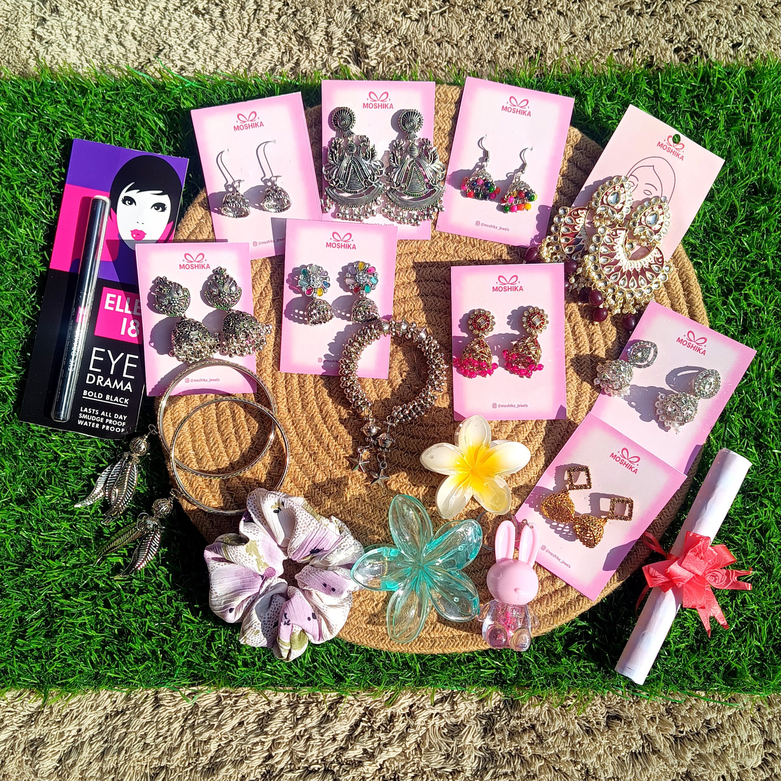 The Jhumka Love Treasure Box is a dream gift for every jhumka lover. This hamper features 9 stunning pairs of jhumkas, paired with classy bangles and a bracelet to complete the ethnic look. Kajal and lip gloss add a soft glam touch, while cute claw clips and a scrunchie make everyday styling easy.