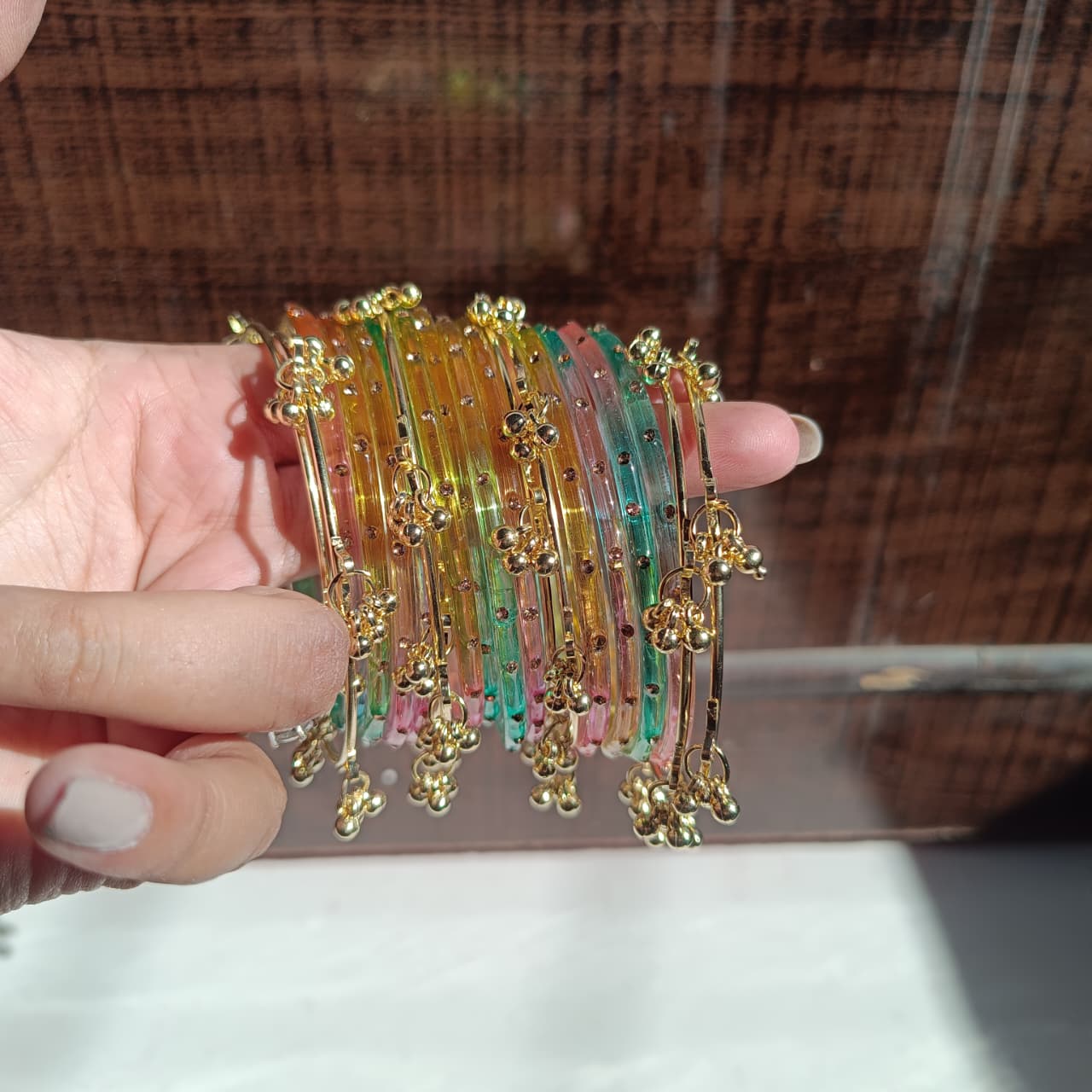 Featuring multicolor bangles with elegant golden charms, this set gives a rich and traditional vibe.