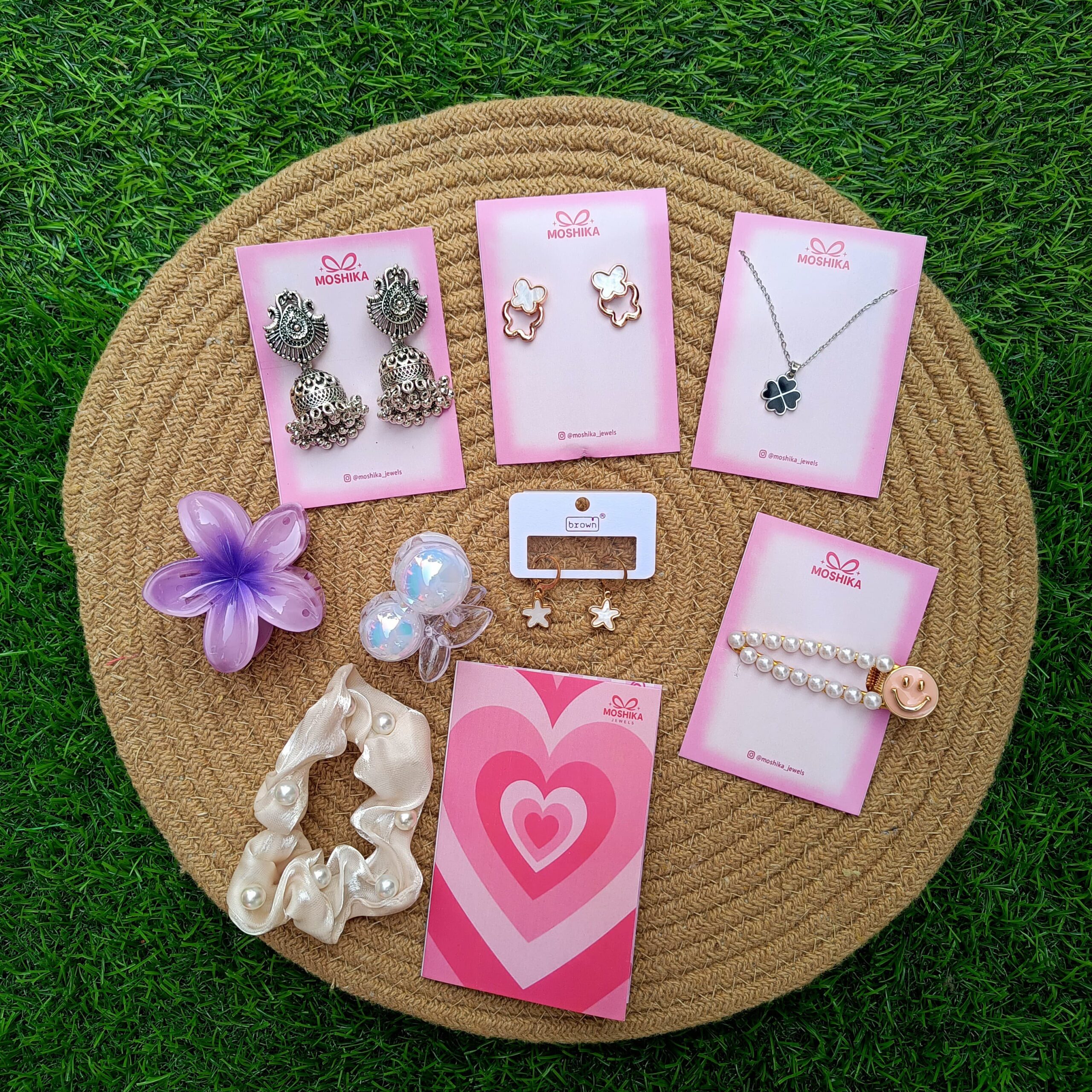 The Mini Birthday Box is a thoughtfully curated collection of must-have jewellery and trendy hair accessories—ideal for daily styling and special occasions. This compact yet highly valuable box includes a mix of elegant earrings, a beautiful pendant, and premium hair accessories, giving the receiver everything they need to enhance their personal style effortlessly.