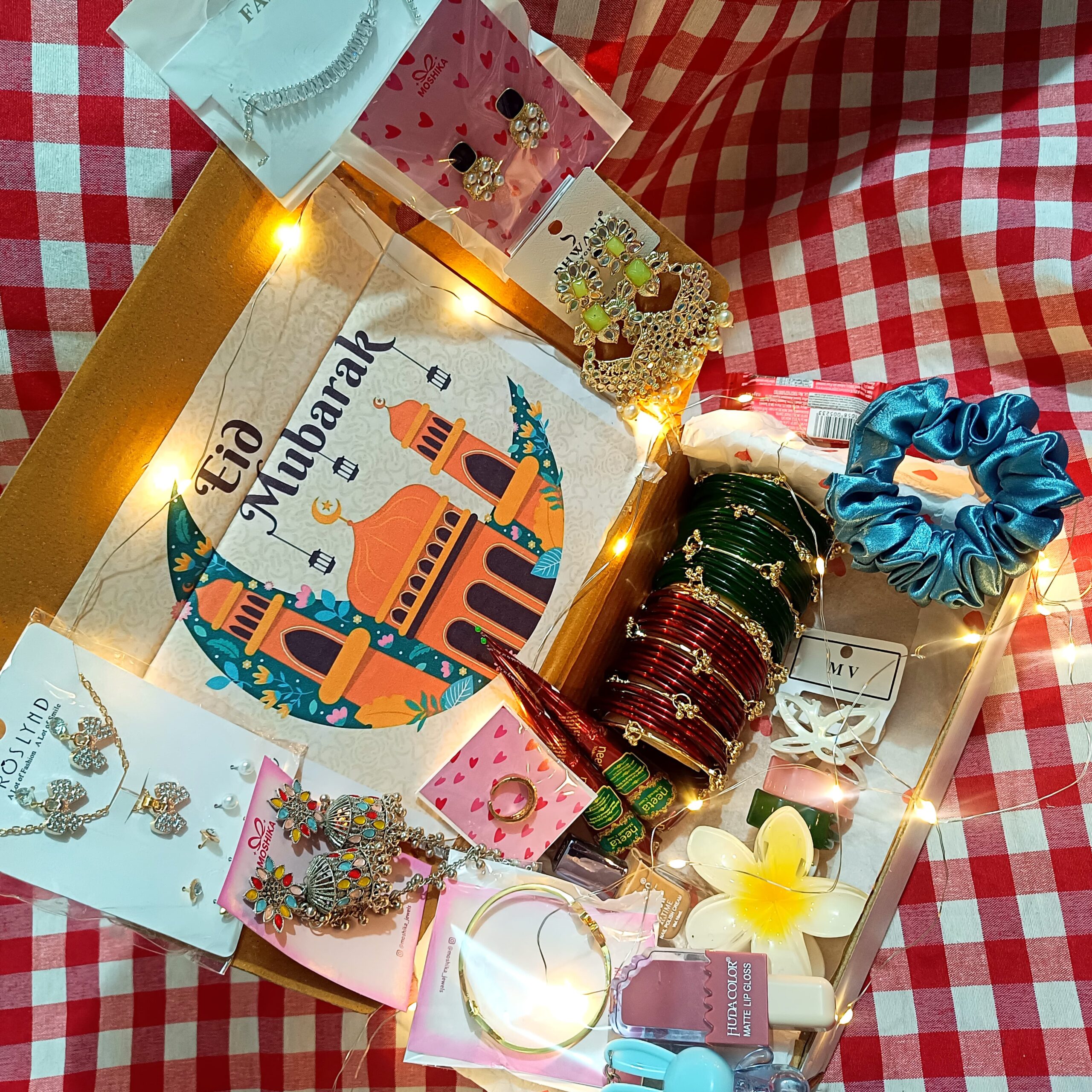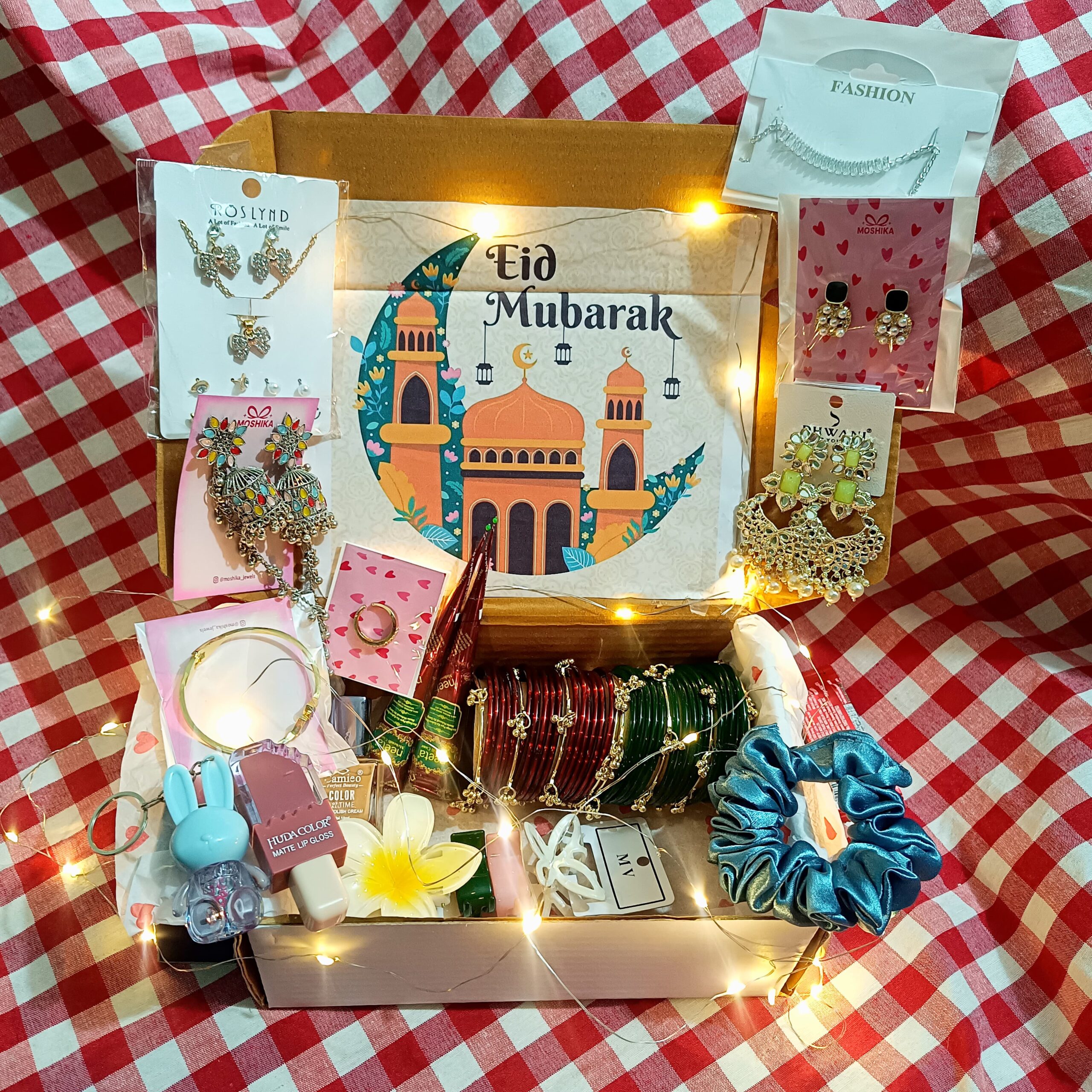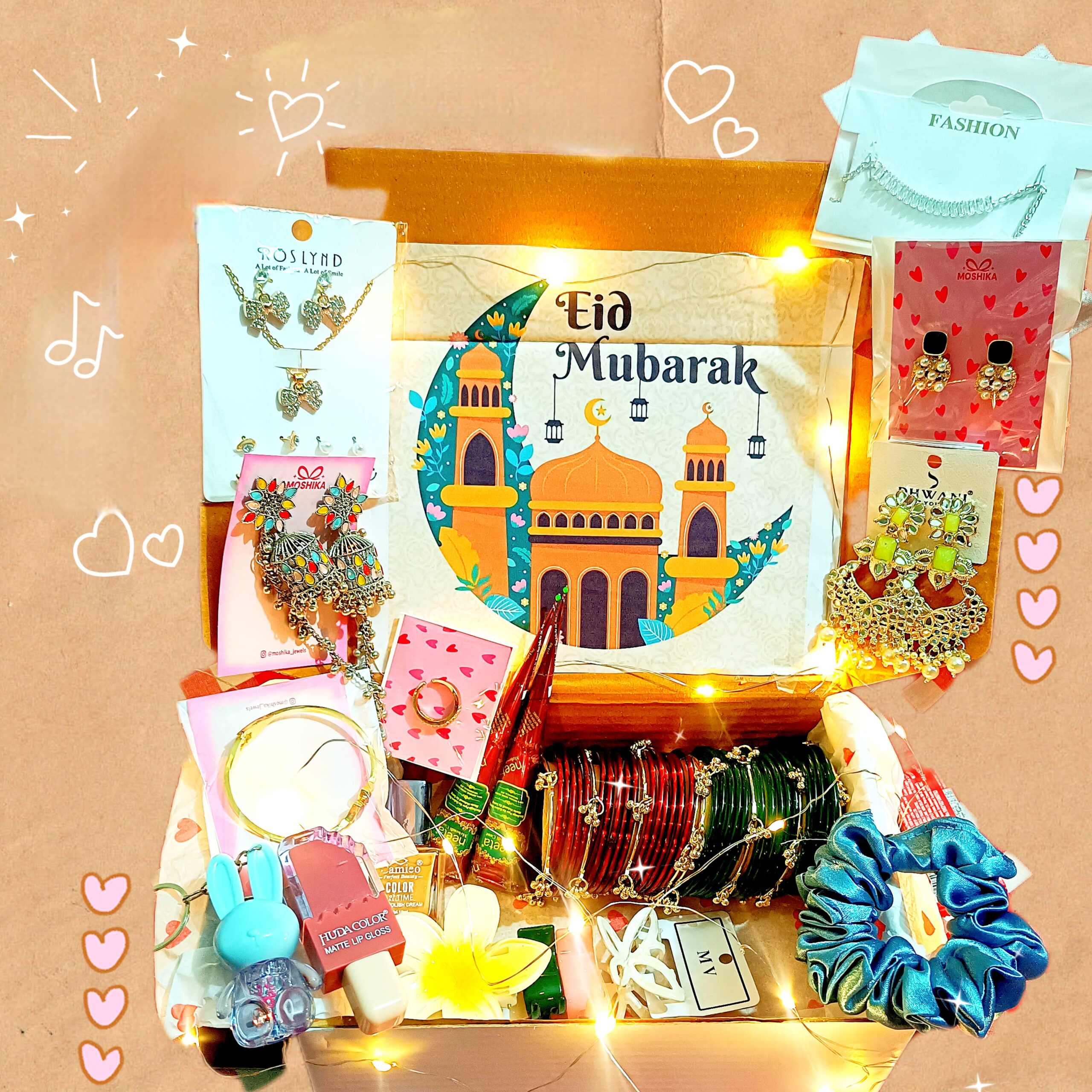 From stylish bangles and beautiful jhumke to trendy makeup and cute accessories, every item in this hamper brings together elegance, beauty, and celebration. The charming decorations, sweet touches, and personalized card make it a heartfelt gift for loved ones.